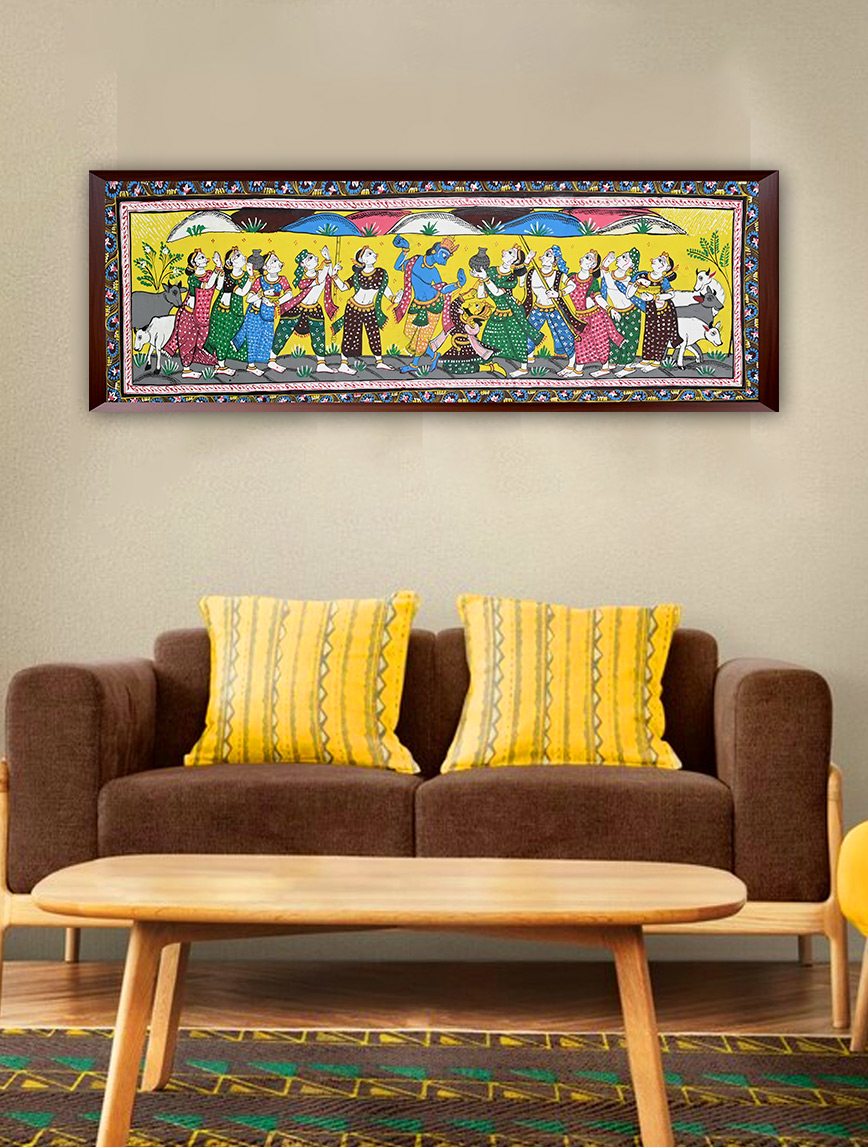 Divine Patachitra Wall Décor - Goverdhan Mountain of Brindaban with Sri Krishna & people of Vrindaban. (40 x 14 Inch) Type-2