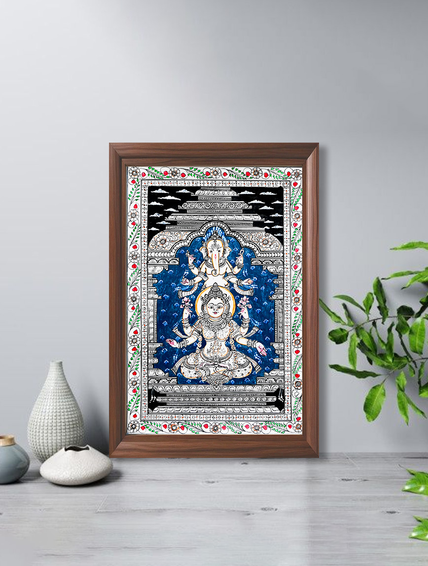 Lord Ganesh and Mata Laxmi in side Temple-Divine Patachitra Wall Décor. ( 12 x 18 Inch) Type-1