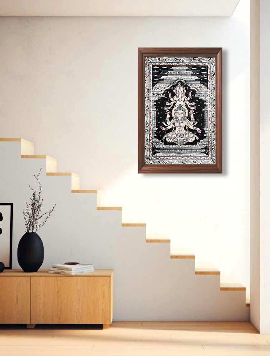 Lord Ganesh and Mata Laxmi inside Temple-Divine Patachitra Wall Décor. WITHOUT FRAME ( 12 x 18 Inch) Type-1