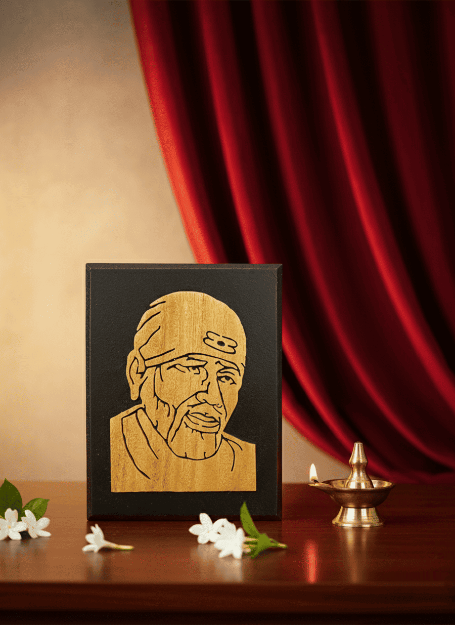 Sai Baba Face on a wooden board. It will enhance the beauty and spiritual environment in the home. ( 7 x 9 Inch )