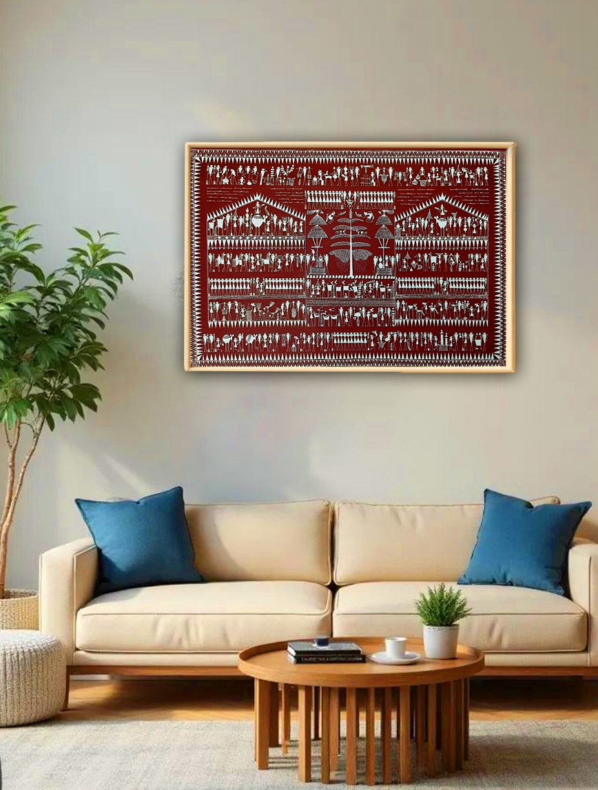Saura / Warli Art- Traditional Village life on canvas. This wall décor will enhance the beauty of the Living Room. WITHOUT FRAME (36 x 24 Inch) Type- 1