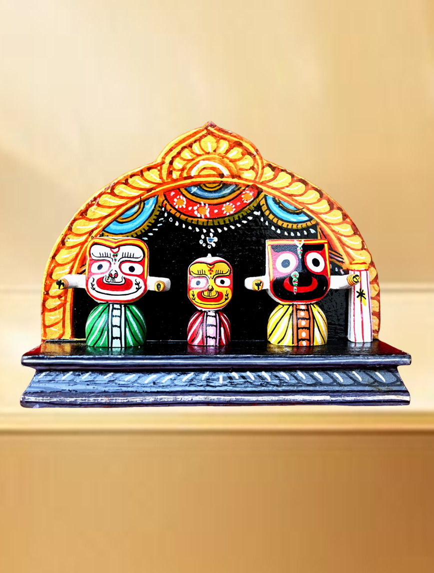 Wooden Lord Jagannath with Brother Lord Balabhadra and Sister Devi Subhadra on Singhasan. Best for home décor and car Dashboard ( Stand Size-7 x 2 x 4.5 Inch. Idol Size- 2 inch) Type-1